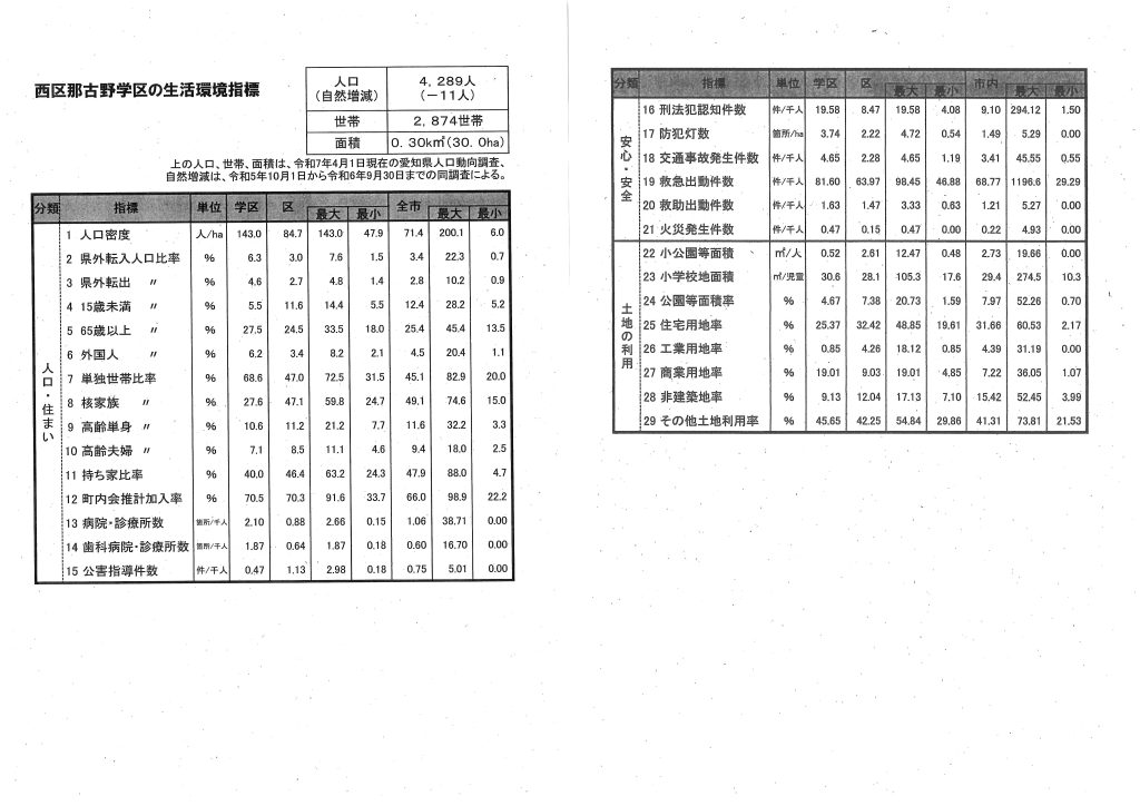 「那古野学区の生活環境指標」令和7年4月1日現在