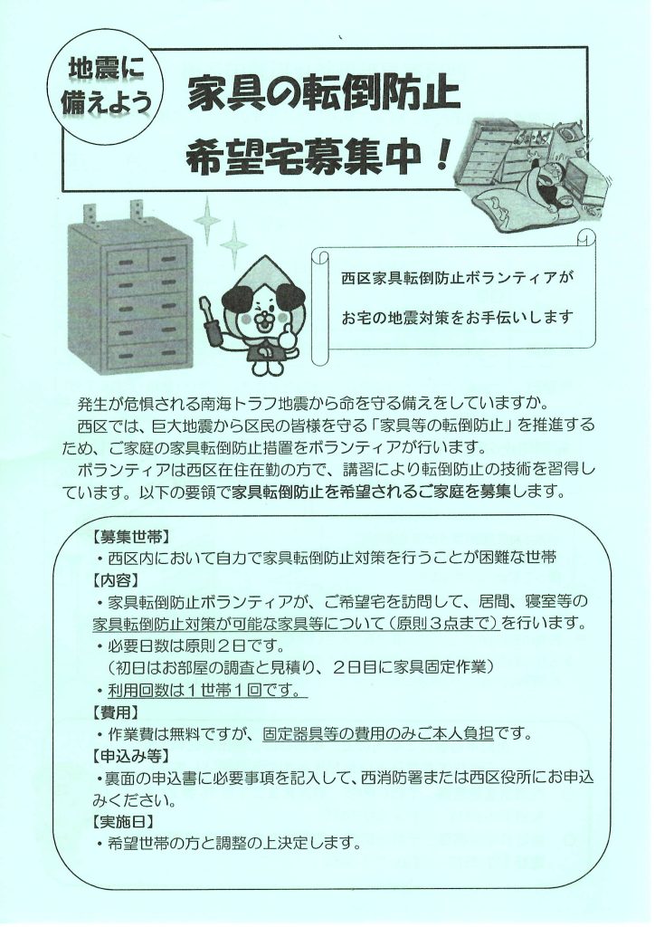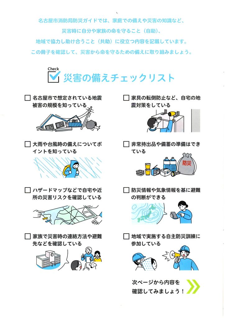 名古屋市では「家庭と地域の防災力向上のために!消防職員が各戸訪問による防災の啓発活動」を実施しております。 那古野学区は1月27日(月)に「沢井北町内」から各戸訪問して非常持出品の準備・家具の転倒防止対策・ ハザードマップの確認等の啓発活動をスタートしました。順次 他の町内にも展開して参ります。