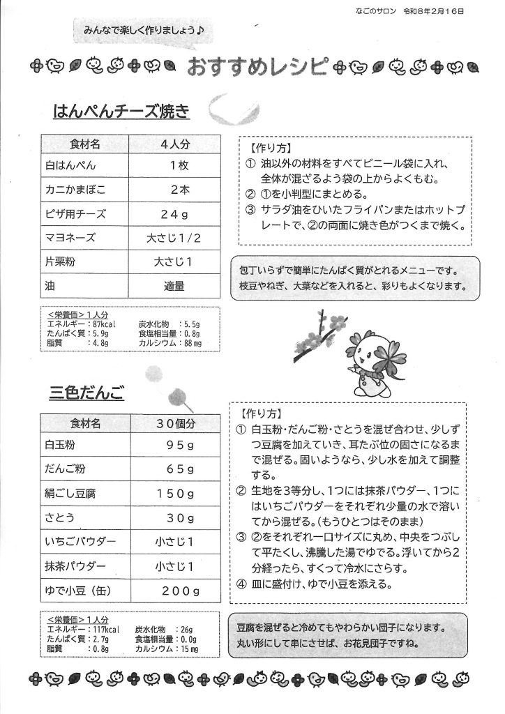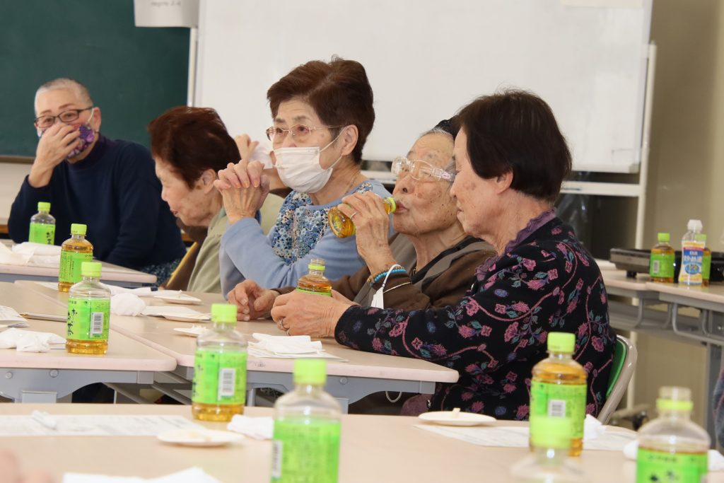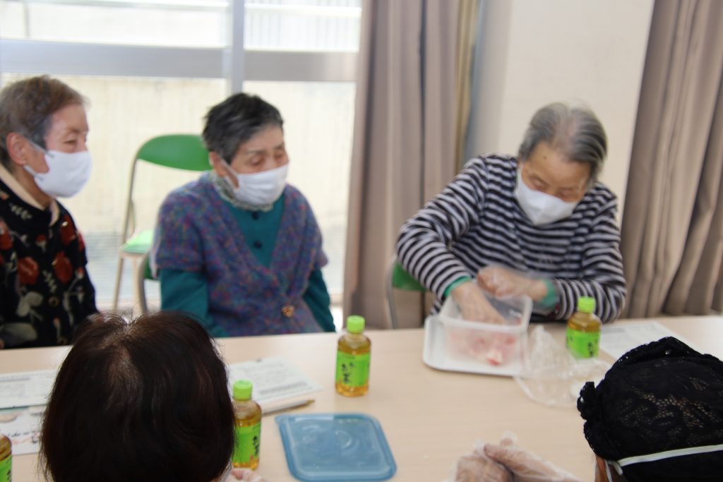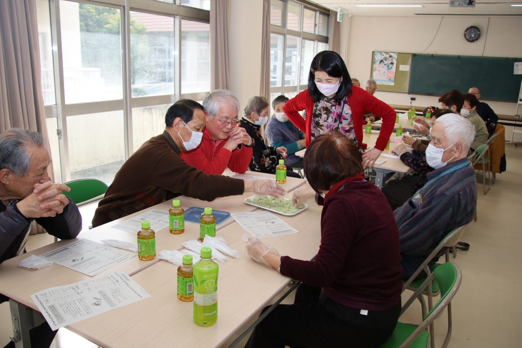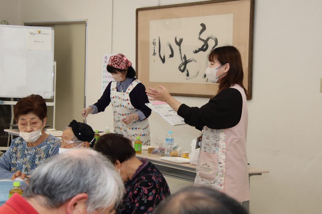 2月16日(月) 那古野コミセンにて "高齢期の食事”をテーマに「健康教室」を開催しました。 西保健センター/保健予防課の水浦様、長谷川様、伊藤様にお越し頂き ”高齢者の食生活”の「新ガイドライン」の指導と みんなで実際に簡単にたんぱく質が取れる料理等を作り”美味しく” 頂きました。 高齢者は栄養状態が悪い「低栄養」がフレイルが進行する要因になるとの事で魚・油脂・肉・牛乳・野菜・海藻・芋・卵 大豆・果物を毎日バランス良く取ることを心掛ける事が重要との事!