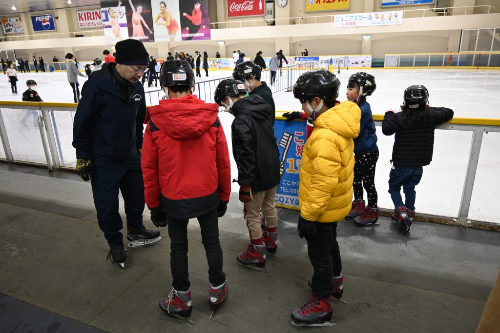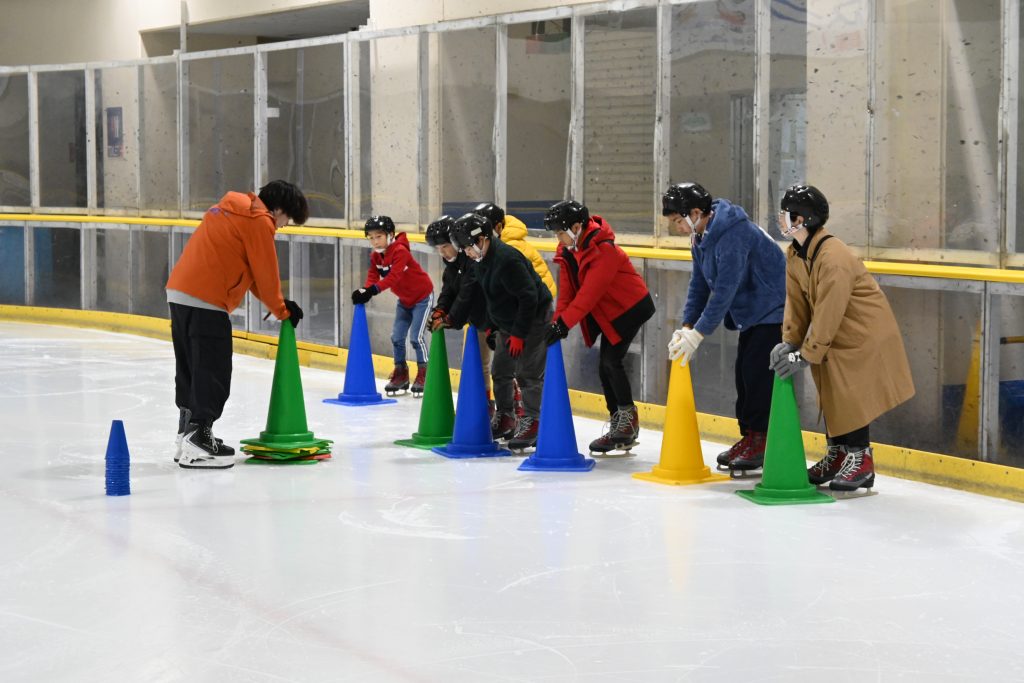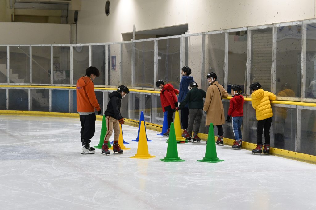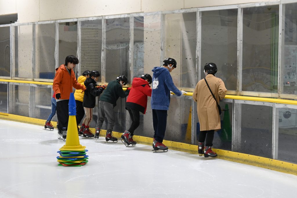 スケート教室ではスケート靴の履き方から、氷の上に出る前の立ち方、氷の上での立ち方と歩き方、転んだ時の立ち上がり方、バランスのとり方など細かく指導してもらいました。