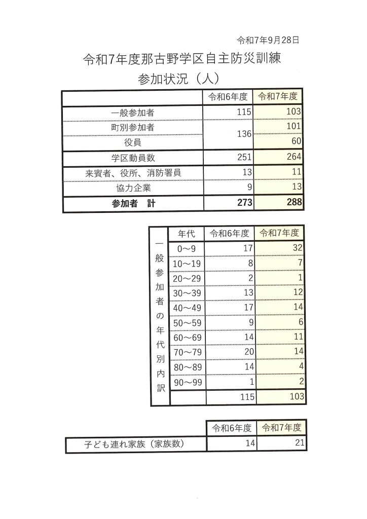 学区内参加者及び消防団・連絡協議会・区政委員会のスタッフも含め288名(内訳:画像ギャラリー内資料参照)の方に参加して頂きました。厚く御礼申し上げます。